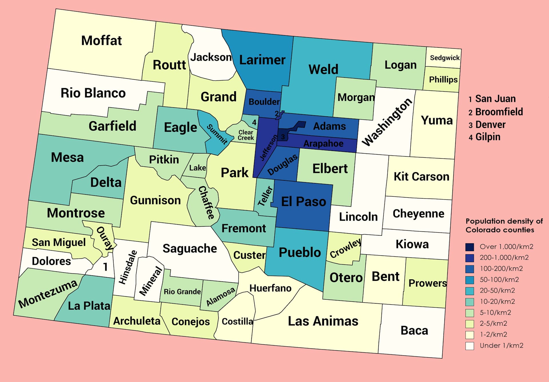 Population Density and Map of Colorado Counties,
